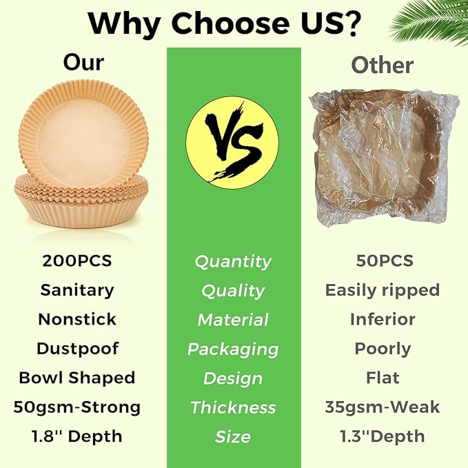 - Food Grade Materials: Made of food grade parchment, with a plant based oil treatment, our air fryer liners disposable is unbleached, BPA-free, PFAs-free, water-proof, oil-proof, non-stick, heat-proof that can withstand temperatures up to 428°F