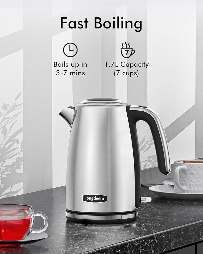- Quick Boiling: Set out with a hot cup of tea, thanks to the LONGDEEM Electric Kettle Retro Series. It packs a 1500W punch, boiling 1.7 liters of water within minutes. Simply fill, and wait