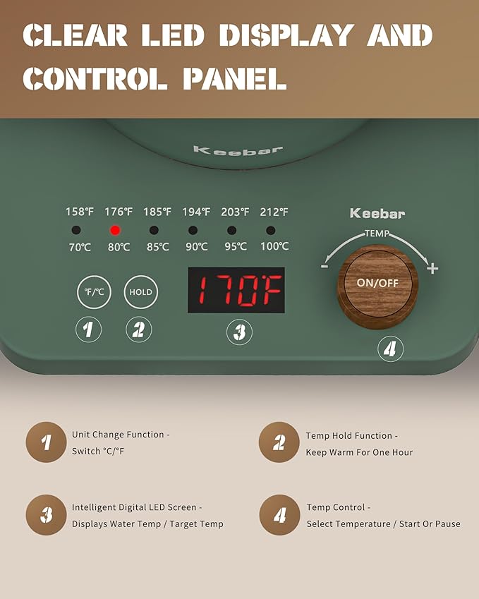 - 6 Easy Presets & Keep-Warm Control - Elevate your brewing experience with six preset temperatures ranging from 158°F to 212°F. Easily adjust the settings with a simple twist of the knob and switch between Fahrenheit and Celsius. The LED screen displays the real-time water temperature, while the keep-warm function maintains it for up to 60 minutes.