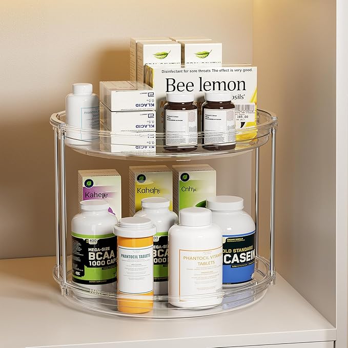 - Compact Size: Measuring 9.25'' diameter, 7.9'' height, Our 2 tier lazy Susan organizer is greatly for various organizers and storage needs and it's a spice organization for kitchen cabinet pantry, fridge, makeup or perfume organizer for bathroom, vanity, a medicine cabinet organizer and more