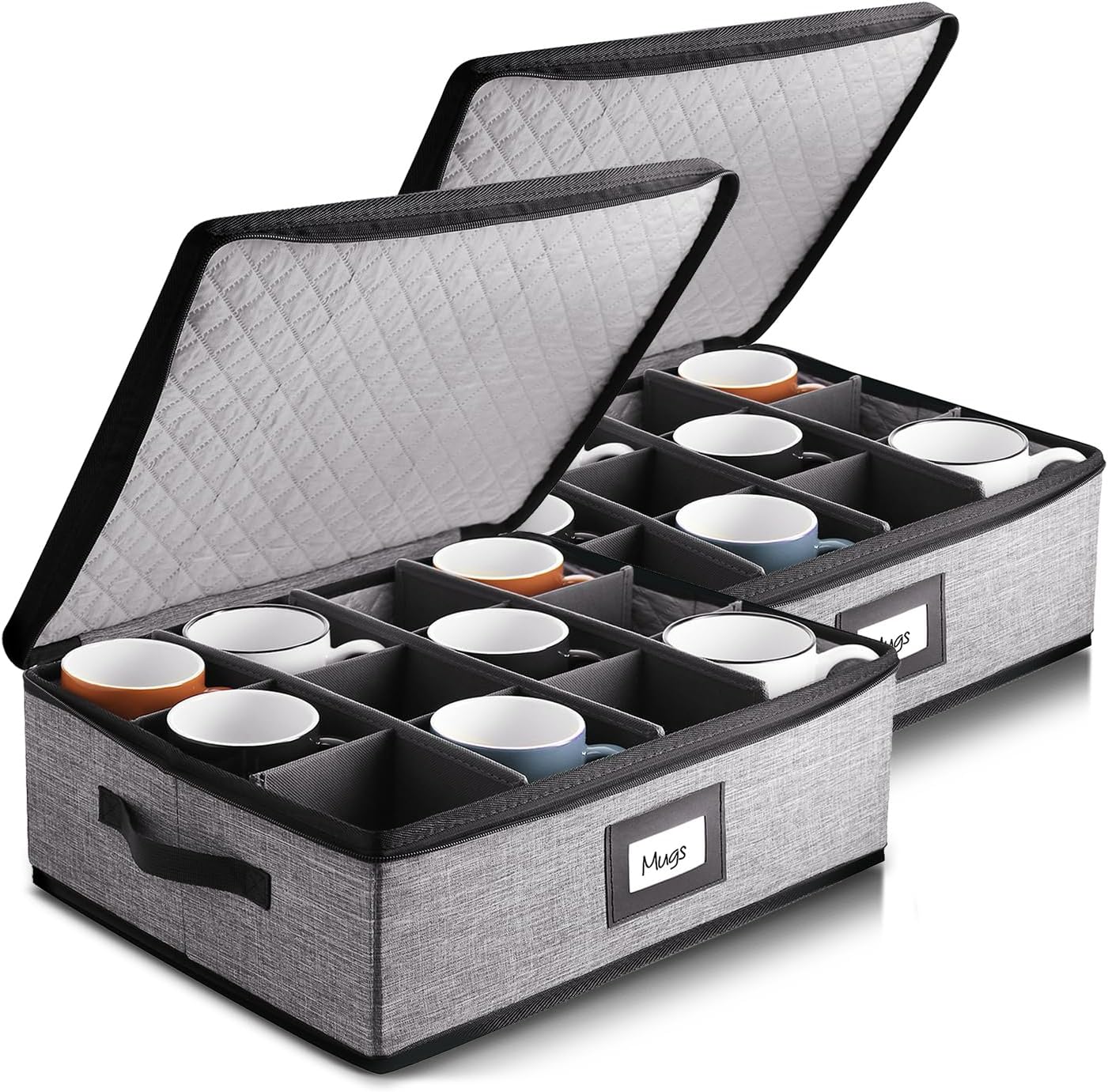 Coffee Mug Storage, 2 Pack Quilted and Stackable Coffee Cup Storage Organizer for Service of 24, Mug Storage Box with Dividers, China Containers Hard Shell for Moving and Organization, Grey