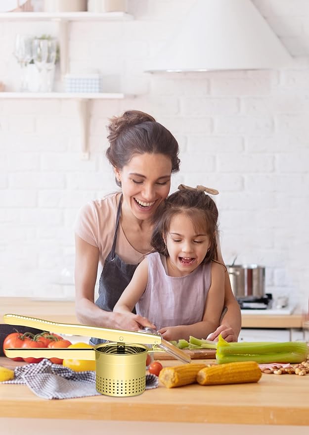 Large 15oz Potato Ricer Masher, Heavy Duty Stainless Steel Potato Masher with Ergonomic Handle, Masher and Ricer Kitchen Tool for Mashed Potatoes, Noodle Maker, Gold
