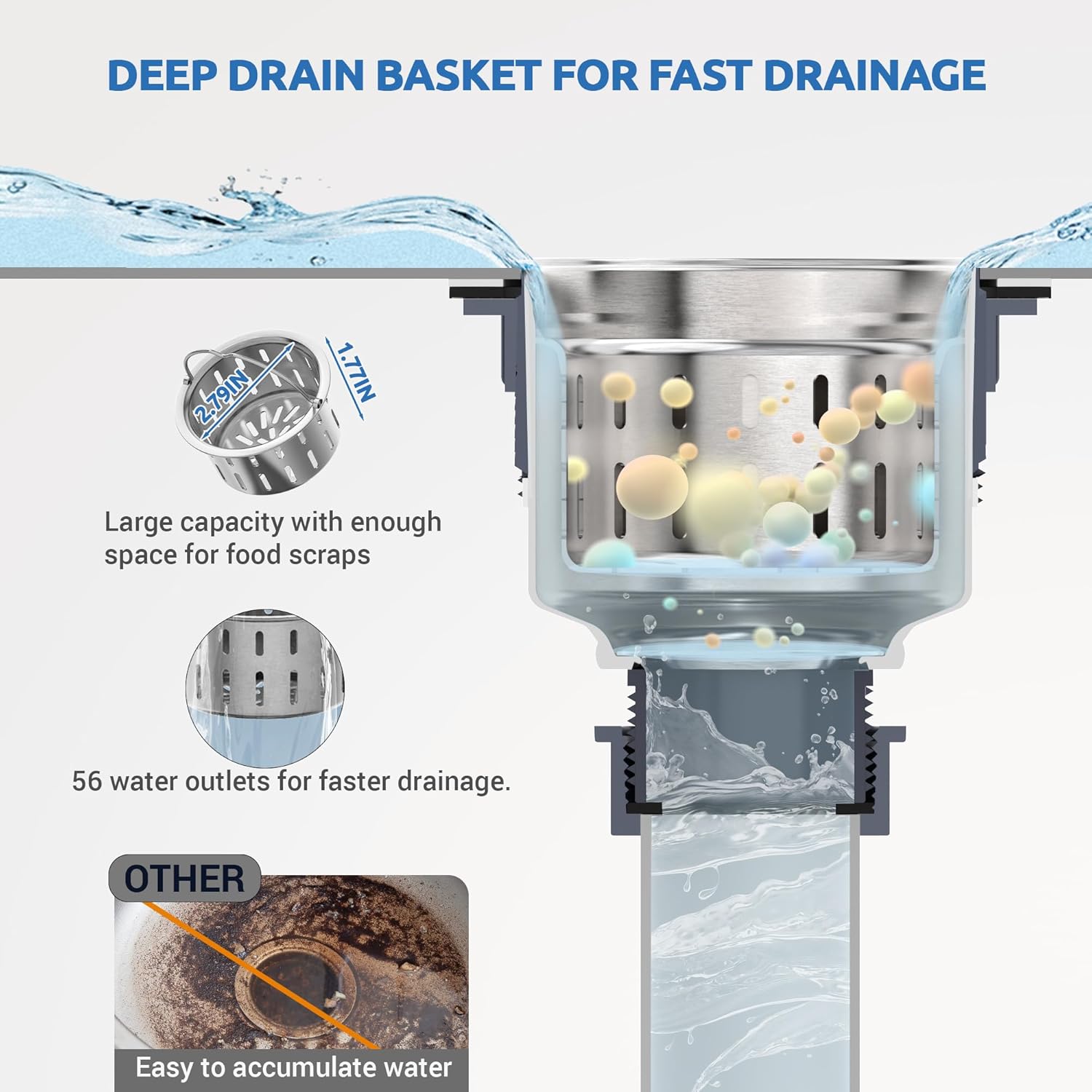 - EFFICIENT DOUBLE FILTRATION: Stainless steel sink strainer with removable deep strainer basket has 56 drain holes to quickly intercept food debris and jewellery and prevent clogging. The bottom divider prevents knives forks from falling down the drain