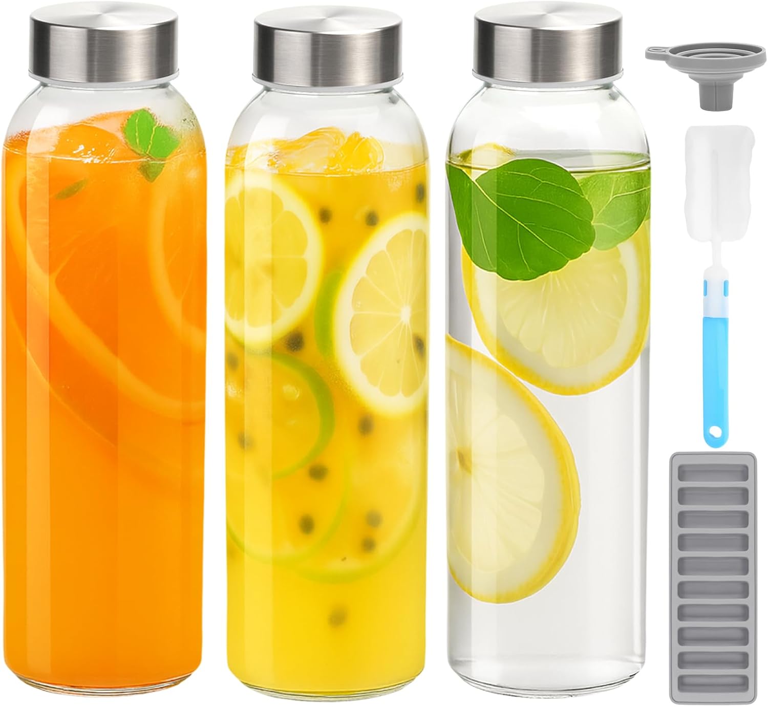- AIRTIGHT AND LEAK PROOF: Juicing Kit Bundle includes : 3 pack clear 24 oz Zukro glass juice bottles with airtight lids, a bottle cleaning brush for easy hand washing, a funnel helps you pour liquids inside the glass containers, an ice stick tray makes long and narrow ice cubes for adding ice easily, extra 1pc stainless steel airtight lids to ensure that the reusable glass bottles always remain sealed. Get our juicing bottles in bulk packs as gift for your whole family and friends