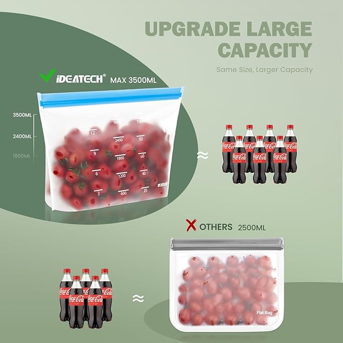 - Stand Up Design , Larger Capacity: The reusable bags can stand up in the fridge which will make your fridge organized,can storage meats meal, vegetables, frozen foods, cereal, fruits