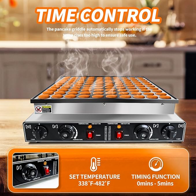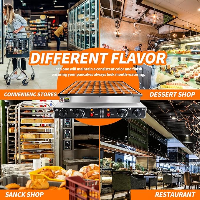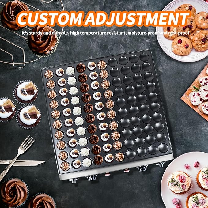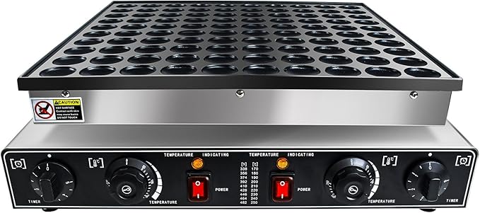 - This Dutch Pancake Baker is made of high quality food grade stainless steel body and non-stick cast aluminum plate material,with the advantages of rust resistance and durability, it is widely used in professional kitchens, bake more quantity, can bake 100 mini Dutch pancake maker at a time, perfect for commercial use!