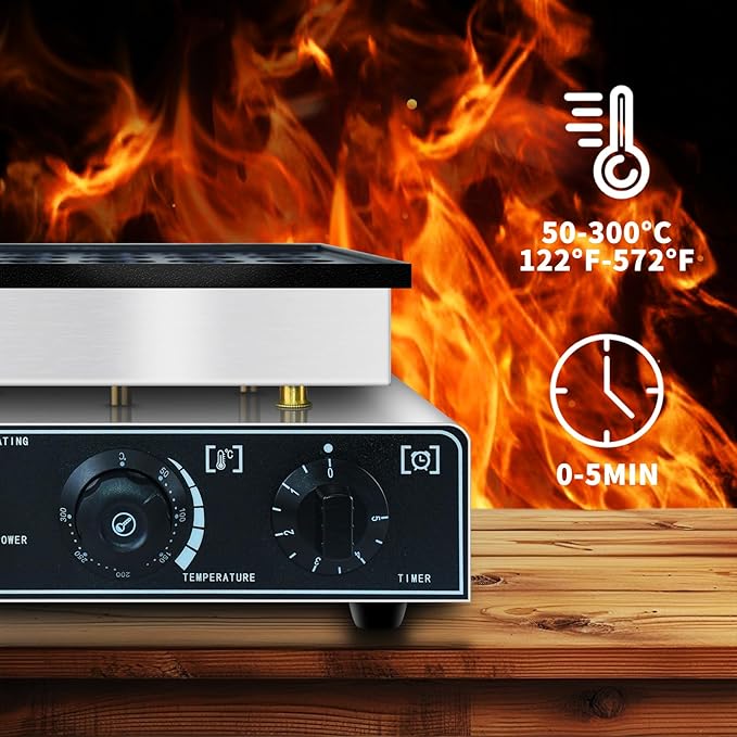 - The commercial large waffle maker comes with two thermostats and a 5-minute timer setting for individual control of different zones.The indicator light will show the working status of the waffle maker.The light will turn red to indicate that the machine is starting to heat up. When the timer time is up, it will make a loud sound to remind you of the