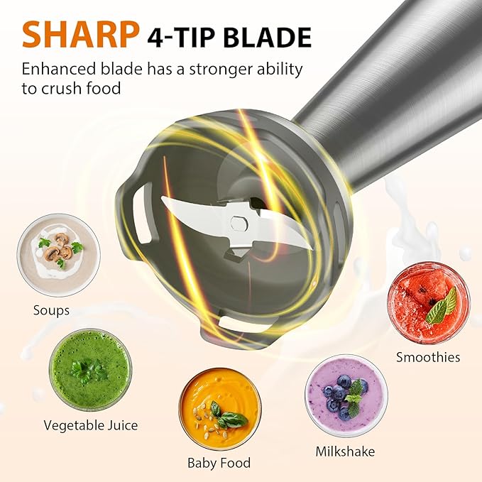 - 1000W Motor & 304 Stainless Steel 4-tip Blade: Compared with other 300-500W motors, upgraded KOIOS handheld blender is equipped with a 1000W all-copper motor, which is more powerful and has a stronger ability to crush food. With 304 food-grade stainless steel blades, this material has good oxidation resistance and high temperature resistance. Safe to use even in hot soup.