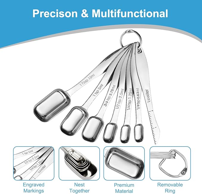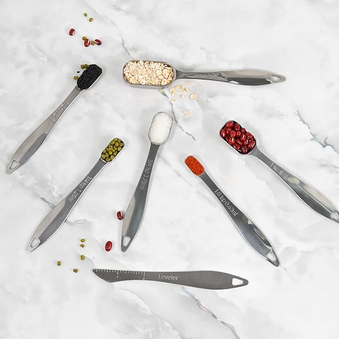 - Easy to Measure: Each measuring spoon and cup features clear scale marks, the stainless steel measuring spoons feature a slim and narrow profile, enough to fit into most spice jars.