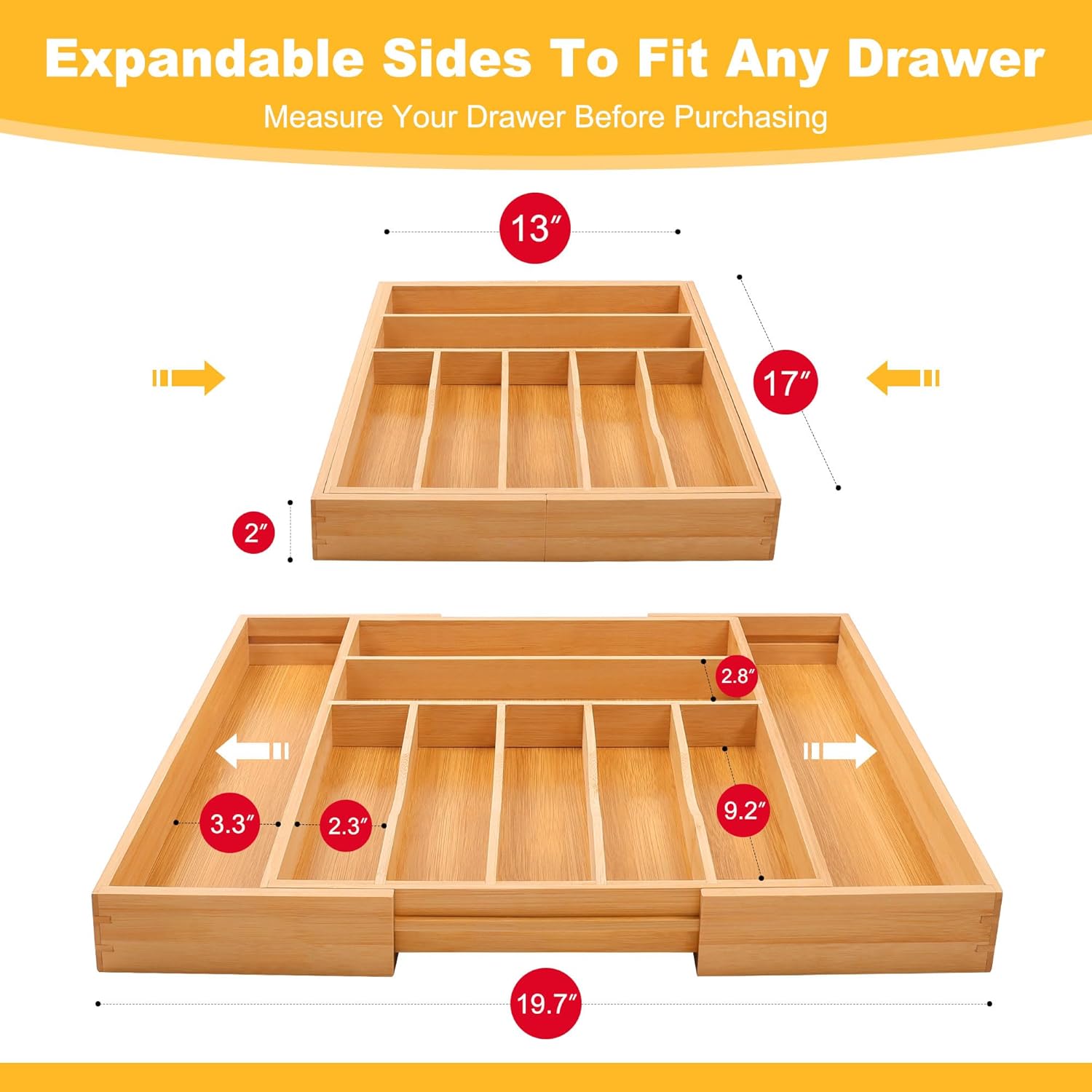 - â ăExpandable to Fit Most Standard Kitchen DrawersăOur deep bamboo drawer organizer is ideal for saving kitchen storage space, thanks to its adjustable storage drawers that expand from 17âx13â to 17x19.7â wide with 1.9â deep slots. This drawer simply pulls away from both sides to expand from 7 to 9 compartments for extra storage space and to make the wider drawer more stable. Different sized compartments are available to store standard silverware and large cutlery.