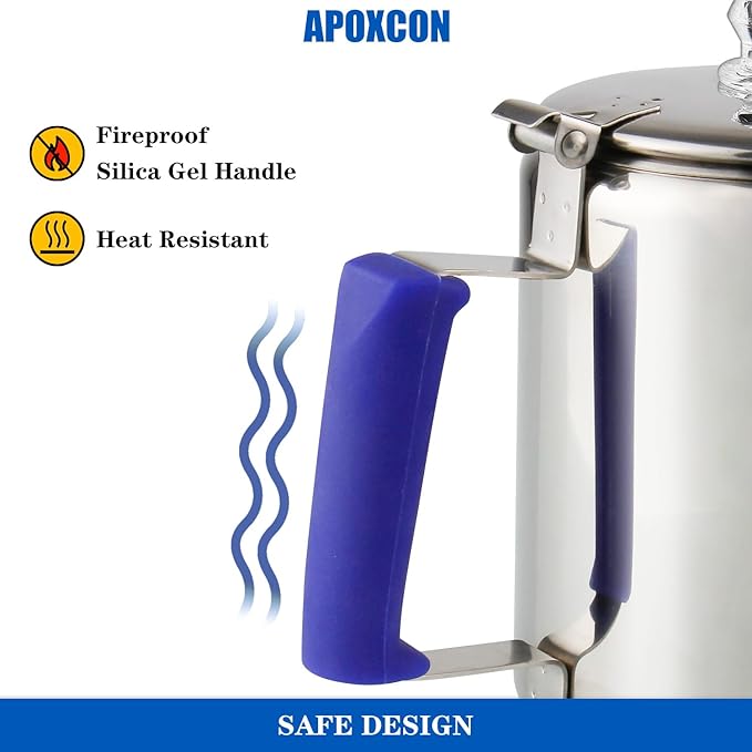 - 【OUTDOOR AND INDOOR USE】 This coffee percolator is designed for outdoor and indoor use. It’s suitable for induction cooker, ceramic electric stovetop and gas stovetop, as well as grills and campfires.