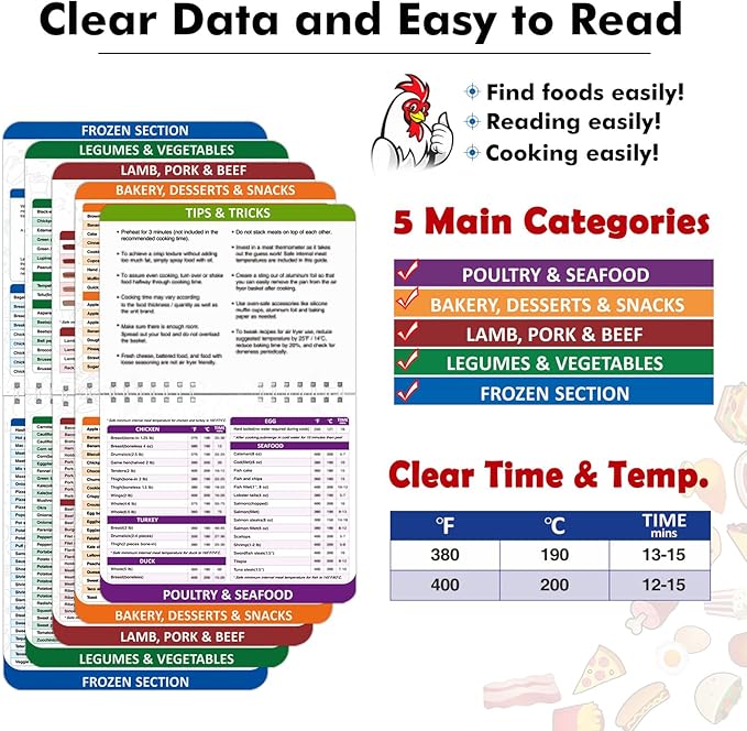 TZARROT Air Fryer Magnetic Cheat Sheet Set, Over 200 Foods Air Fryer Cooking Guide Flip Chart Magnetic, Air Fryer Accessories Cooking Time Charts and Recipe Booklet