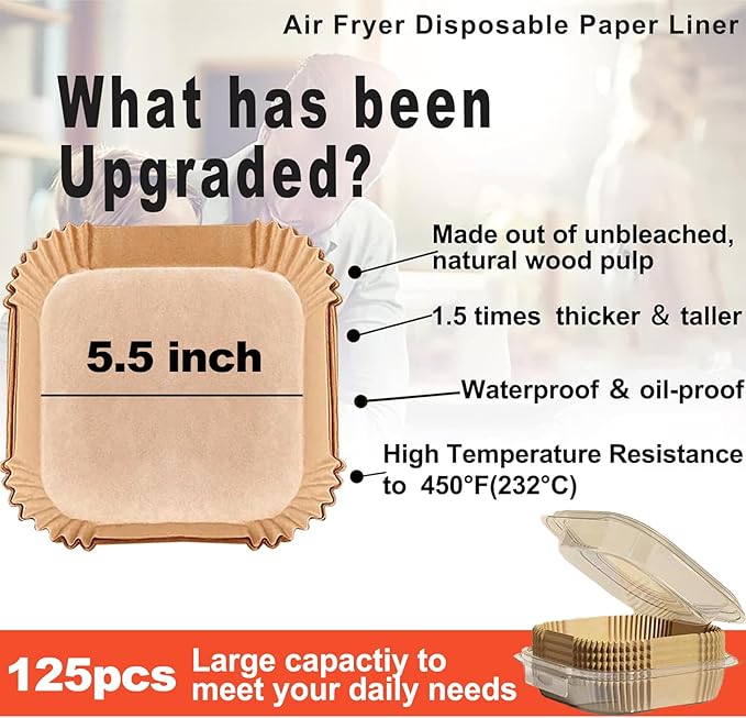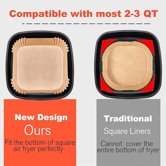 - 【Info】Small Size. 5.5 Inch.125Pcs. Air fryer Parchment paper liners for 2-3qt air fryer are designed with a square bowl shape. Bottom size 5.5 inches, perfects for mini air fryer. Fit Cosori 2.1QT.