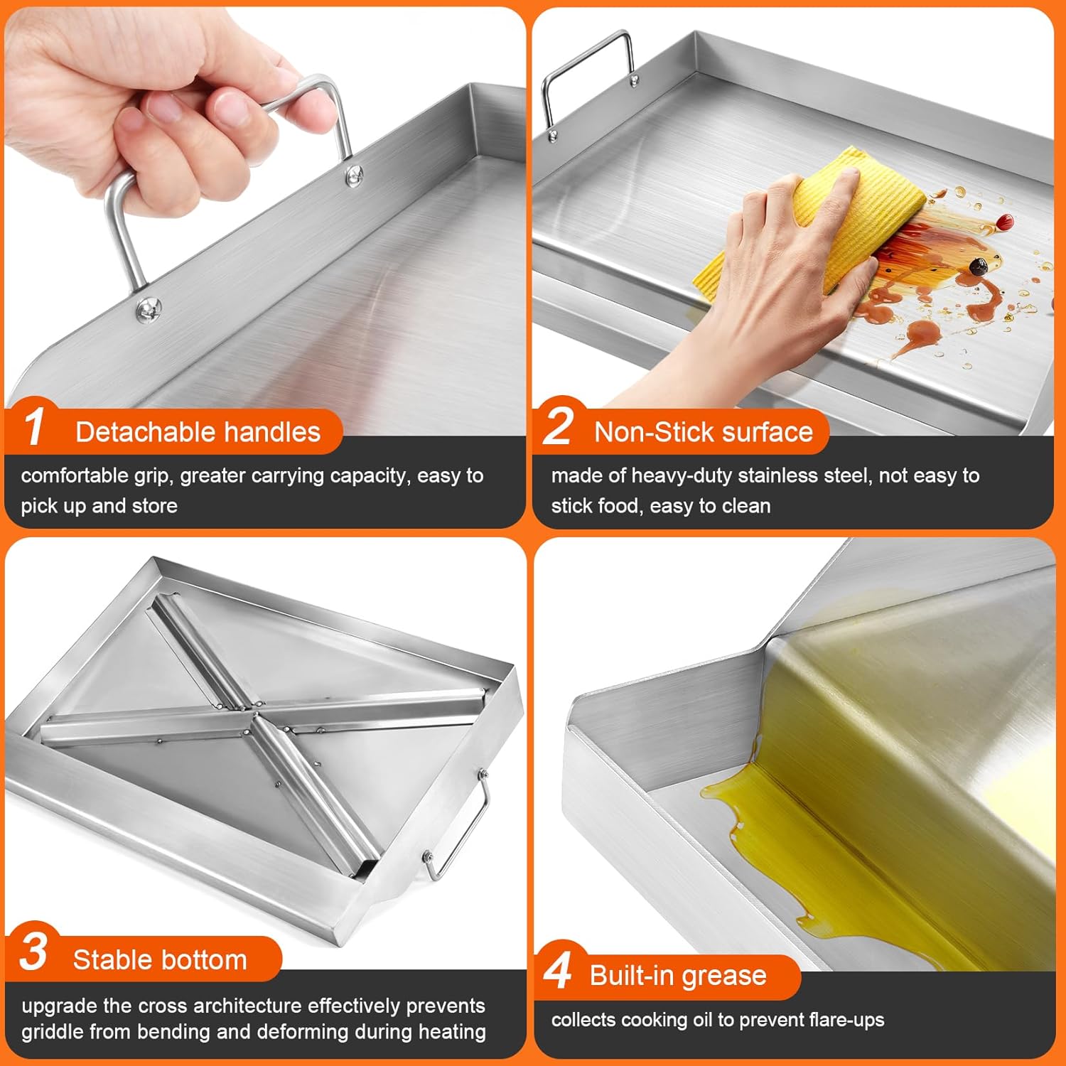 - 【High Quality Stainless Steel Cooking Griddle- Non stick】: The universal flat top griddle pan made of food grade stainless steel. Stainless steel griddle can heat food faster and more evenly, and are easier to clean. You no longer have to worry about stuck-on food particles