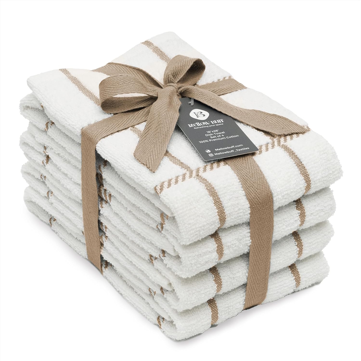 - Mellow buff dishcloths and dishtowels are made of 100% cotton with supreme quality and exquisite workmanship. Designs are simple, perfect size and it will give the feeling of being home by co-ordinating with most kitchen decor.