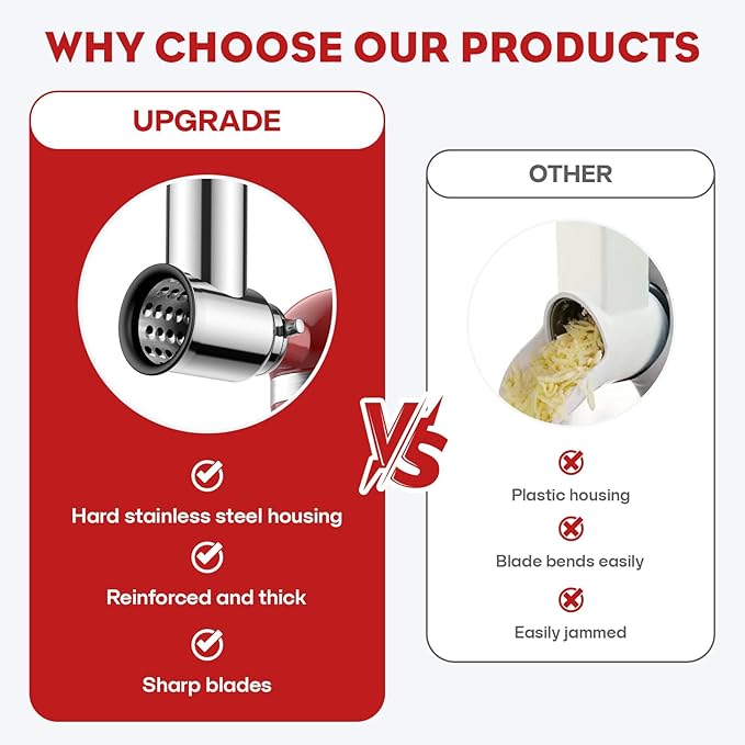- Easy to Clean: The kitchen aid accessories and attachments are straightforward to clean. The inward-facing blades prevent you from injuring your hands during cleaning, making cheese shredder easy to thoroughly clean each blade and accessory. They are dishwasher safe, leaving more time for your favorite cooking and enjoying delicious food.