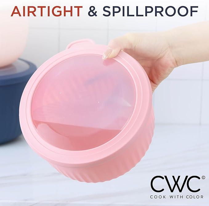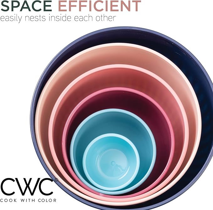 - Cook with Color 12 piece plastic mixing bowl set - non slip bowls with lids; easy to clean, sturdy mixing bowls.