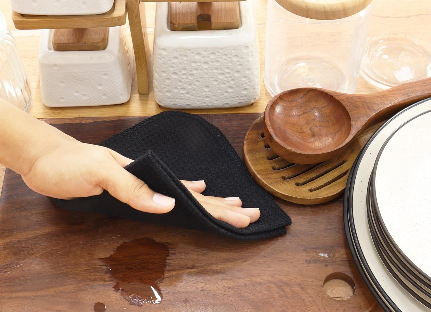PurpleEssences Dish Cloths and Dish Rags - 6 Pack Waffle Weave Solid Kitchen Dish Wash Cloths, 100% Cotton, 12 x 12 Inches, Ultra Soft Absorbent Quick Drying - Spring Summer - Black