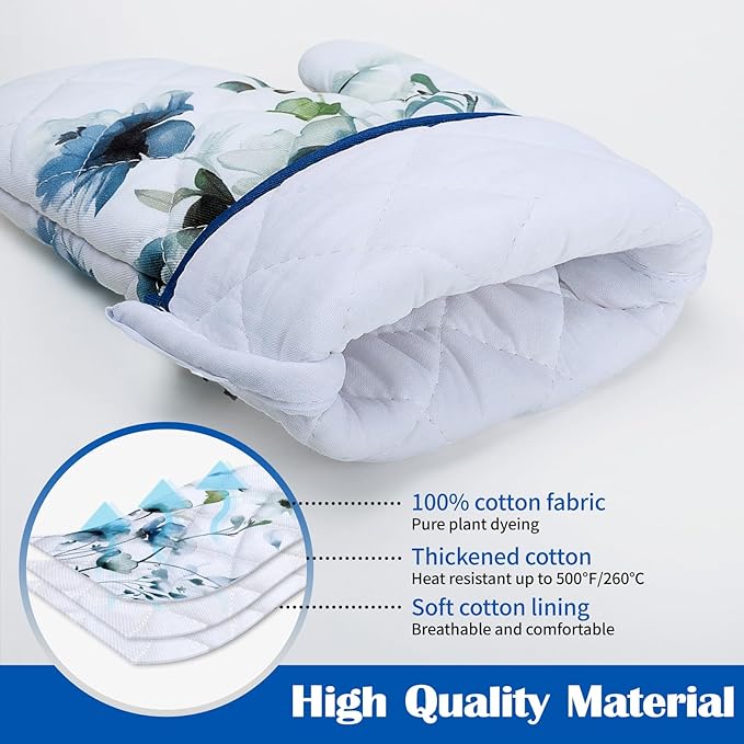 Blue Watercolor Flower Oven Mitts and Pot Holders Sets 100% Cotton Heat Resistant, Extra Long Oven Gloves Potholder for Kitchen Cooking Baking Housewarming