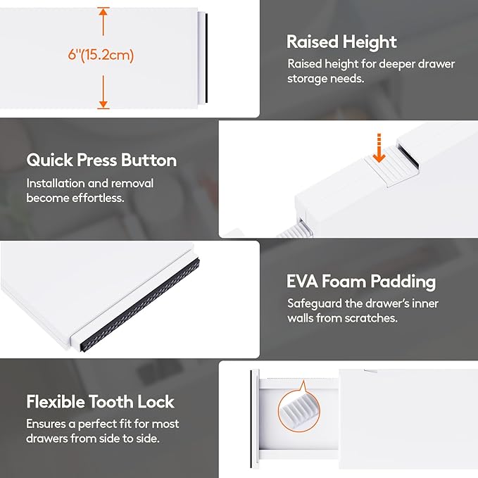 - Easy to Install: To adjust the length, press the top button before placing the drawer organizer, and then stretch it out again to secure it tightly. The strong spring tension keeps each organizer upright and secure. When retracting, press the top button and push in the stretched side.