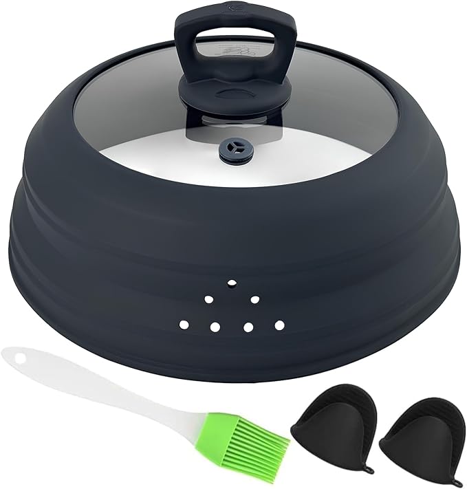 Microwave Splatter Cover Glass 10.5 Inch Microwave Cover for Food with Handle Collapsible Silicone Microwave Cover with Steam Vent for Pot Plate Bowl (Grey)