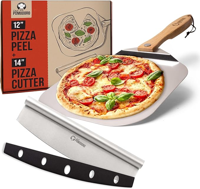 Chef Pomodoro Aluminum Metal Pizza Peel with Foldable Wood Handle for Easy Storage, Pizza Spatula, Gourmet Luxury Pizza Paddle for Baking Homemade Pizza Bread (12 x 14 inch + 14 inch Cutter)