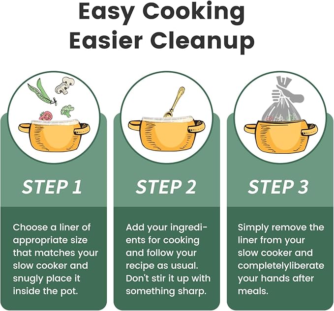- 【Middle Size & Versatile Use】Each cooking bag fits a variety of ingredients and 3-4 qt round and oval slow cookers, making it perfect for everything from family meals to everyday cooking. You can even cook two dishes simultaneously in the same pot