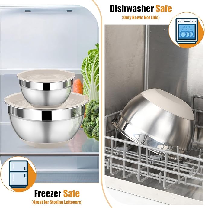 - 【Clean Easily & Attractive】Stainless steel mixing bowl is crafted with brush-polished exterior and mirror-finished interior, Both two sides are easy to release food for convenient to clean by hand, And the bowls are dishwasher safe, Saving your precious time and labor, But the lids are hand-wash recommended, Moreover, Khaki lids and bottoms and shiny silvery stainless steel bowl body are attractive and elegant, Great for enhancing your kitchen decoration
