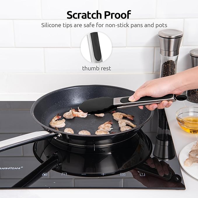 - [Heat Resistant Silicone Tips without Melting & Odor] The silicone tipped tongs are made of Food Grade silicone, which is more Sturdy and has heat resistance (up to 480℉). The silicone tips make them a great partner for your nonstick pans and pots. Thanks to fine workmanship, the silicone tips firmly sealed on never lose its grip.