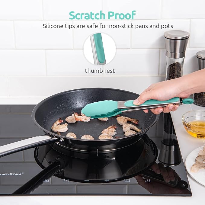- [Heat Resistant Silicone Tips without Melting & Odor] The silicone tipped tongs are made of Food Grade silicone, which is more Sturdy and has higher heat resistance (up to 480℉) than the basic. The silicone tips make them a great partner for your nonstick pans and pots. No more sharp tips to scratch or ruin your cookware. They are heat resistant, so no more silicone parts of the tongs melt off with heat again! Thanks to fine workmanship, the silicone tips firmly sealed on never lose its grip.