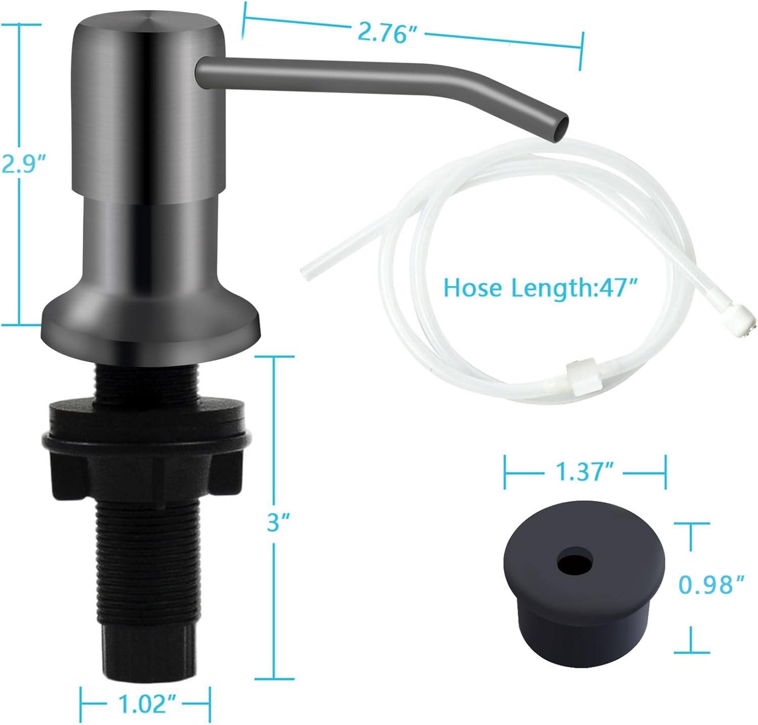 - LONG THREADED SHAFTTUBE -- The kitchen sink soap dispenser with Lengthen and thicken 2.68 inches threaded shaft tube fits most countertops (Granite, Stainless Steel, Wood), durable and not easy to break. With rubber washers on both sides, so u don't have to worry about countertop water leaking through.