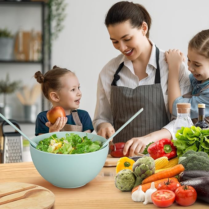 11.3" Extra Large Salad Bowl with Wooden Lid & Servers, 208Oz, Oversized Bamboo Fiber Salad Serving Set with Utensils for Home/Kitchen, Big Lightweight Bowl for Mixing Salad,Fruit,Pasta - Turquoise