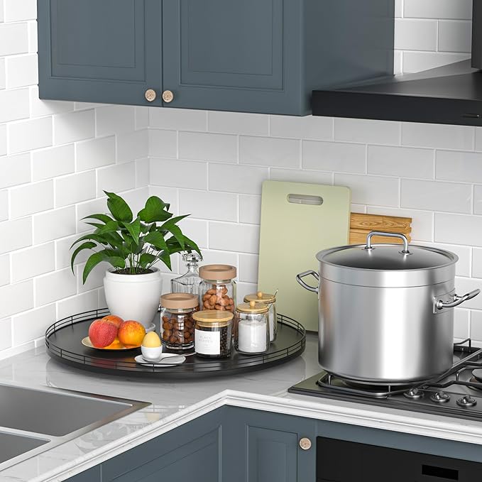 - ๐ง๐ต๐ผ๐๐ด๐ต๐๐ณ๐๐น ๐๐ฒ๐๐ถ๐ด๐ป: The turntable tray features a smooth and silent 360ยฐrotation; Bottom slip-resistant pads for stability and protect your countertop from scratches; Raised edges on each organizer tray to keep items from falling out; Easy to use, no installation required