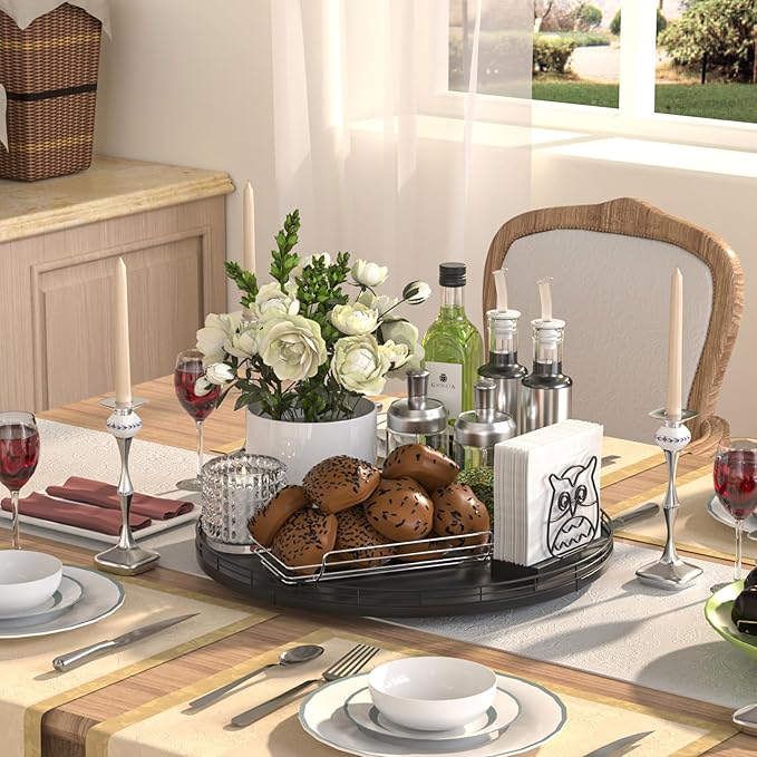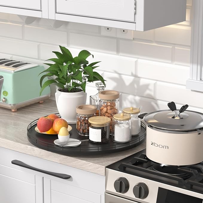 - ๐ง๐ต๐ผ๐๐ด๐ต๐๐ณ๐๐น ๐๐ฒ๐๐ถ๐ด๐ป: The turntable tray features a smooth and silent 360ยฐrotation; Bottom slip-resistant pads for stability and protect your countertop from scratches; Raised edges on each organizer tray to keep items from falling out; Easy to use, no installation required