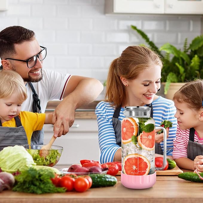 Aofmee 68oz Glass Pitcher with Lid, 2 Liter Water Carafe with Silicone Base and Precise Scale Line, Ice Tea Pitcher for Fridge, Anti-Slip Glass Jug for Sun Tea Juice Coffee Milk Beverage (Pink)