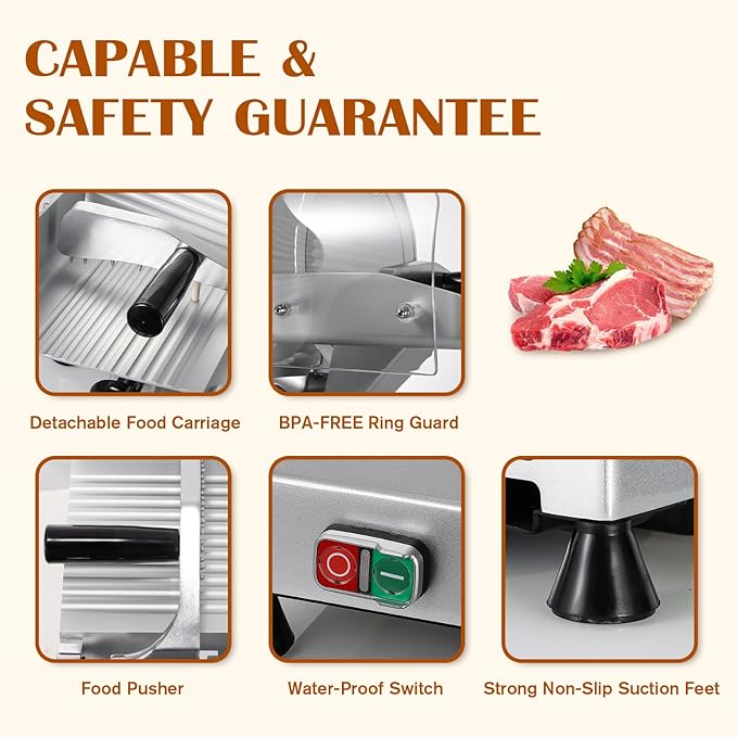 - [Perfect Design]Slicer Machine has a Fixed Transparent Shield can avoid unintentional contact with the blade; a Food Pusher for firmly holding the meat and a Handle for easy operating; Built-in sharpener for quick and safe blade sharpening; Waterproof ON/OFF ensures safety during operation; Non-slip rubber feet ensure stability.