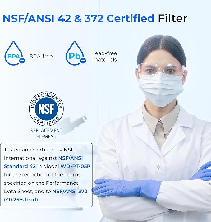- [Authoritative Certified Filtration] The filter used in this water filter system has been tested and certified by NSF International against NSF/ANSI Standard 42 & 372. It can efficiently reduce chlorine, taste and odor, rust, sand and sediments, tested by a third-party lab, providing clean, pure water for you.