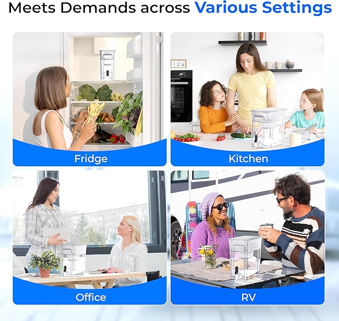 - [Slim Design] Measuring only 14.76 x 5.55 x 10.16 inches, this slim water filter dispenser can be placed anywhere withoug occupying too much space, like bedroom, kichen, fridge, office and RV. Besides, despite its compact size, it has a high capacity of 35 cups, and can meet demands of large families for pure water for a whole day.