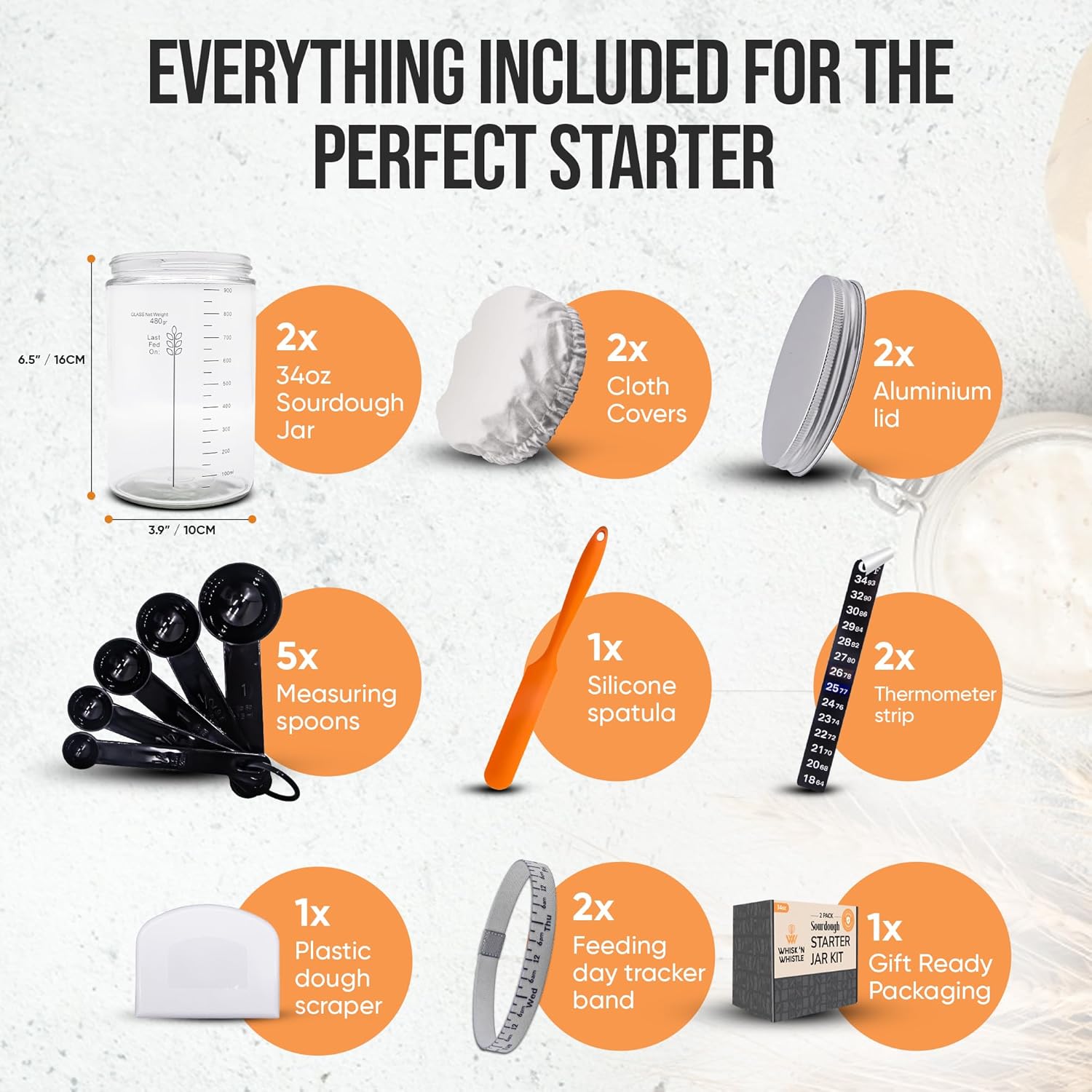 - ALL YOU NEED IN ONE HANDY KIT β This complete sourdough starter kit includes 2x 34 oz fermentation jars, 5x measuring spoons, silicone spatula, metal lid, cloth cover, thermometer strip, feeding band, bread lame, scrapers, and an electronic guide: a must-have bread starter kit and Sourdough Bread Baking Supplies for beginners and pros.
