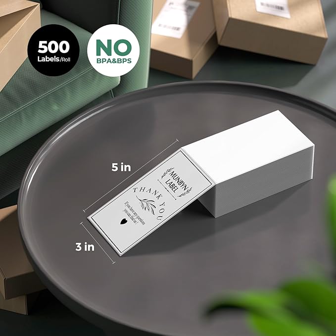 MUNBYN 3x5 Inch Thermal Shipping Labels, Multipurpose Fanfold Thermal Printer Labels for Small Businesses, Shipping Packages, 500 Sheets/1 Roll