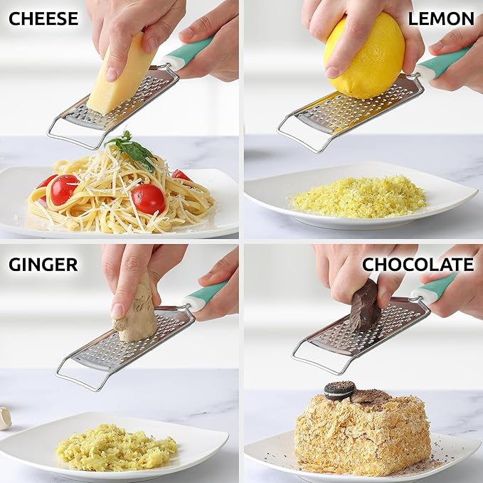 - GRATE WITH EASE & SAVE TIME: Our parmesan cheese grater is made with razor-sharp etched stainless steel blades for enjoying finely grated cheese effortlessly. Sprinkle some flavor over a salad, pizza, pasta, a bowl of soup or use it as a citrus zester for adding a tangy twist to your recipes.