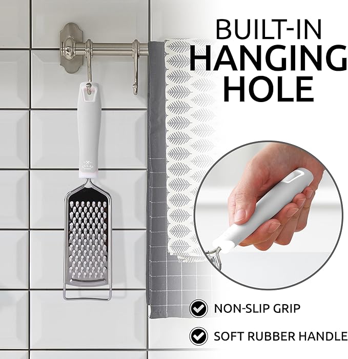 - ERGONOMICALLY DESIGNED: Our handheld cheese grater is designed with a soft thermoplastic rubber handle for a non-slip, comfortable grip. The raised support frame allows it to be set on a solid surface for more control.