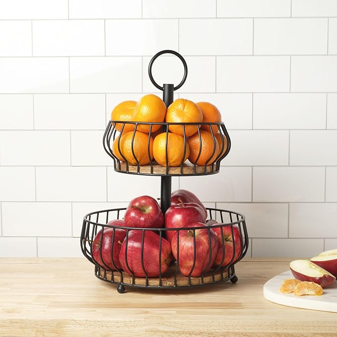 Gourmet Basics by Mikasa Savannah 2 Tier Metal Fruit Storage Countertop Basket, 12 x 12 x 16 Inch, Black