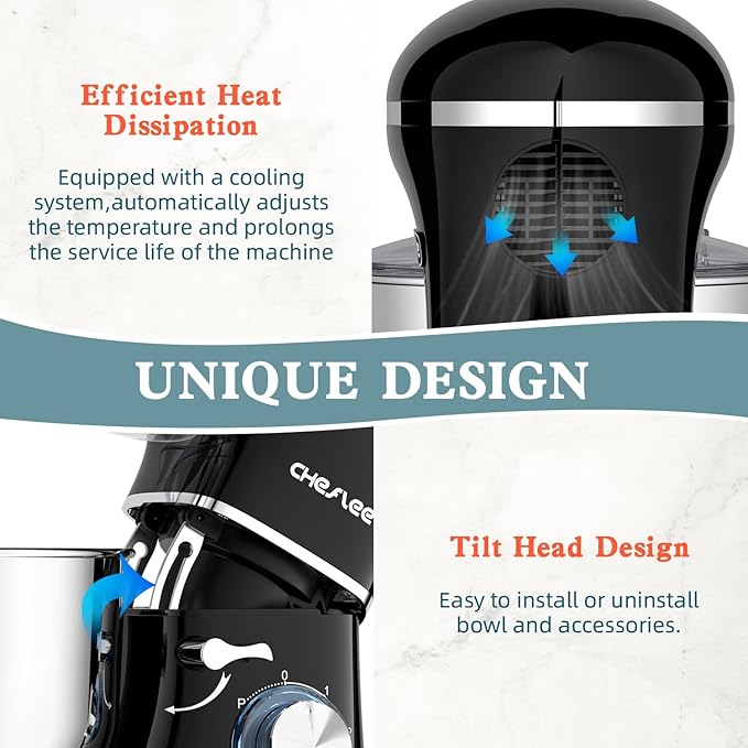- Unique Design - The tilt-head design mixer allows easy access to install or uninstall bowl and accessories.In addition,the dough mixer base is equipped with 6 powerful silicone suction cups keeping the machine stable during operation.