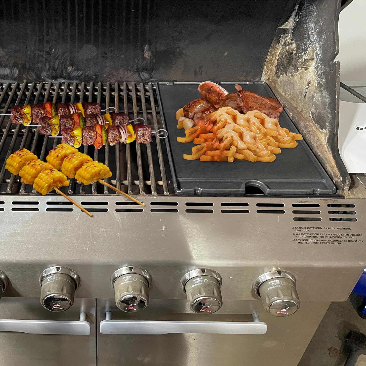 - Doublesided Grilddle: Reversible griddle plate made of premium quality and sturdy cast iron. On the smooth side, cook eggs, pancakes and bacon. On the ridged side, grill steaks, burgers, fish, chicken and veggies.