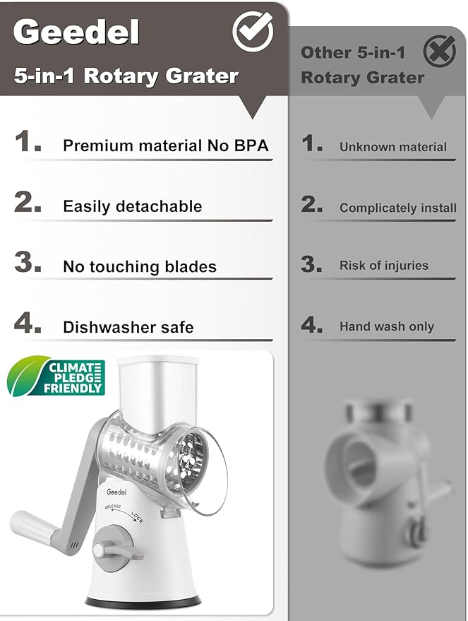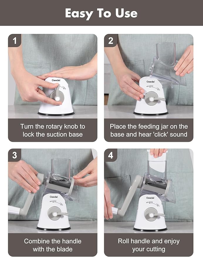 - Safe to Use : The cheese shredder is made of premium food grade ABS material, no BPA, so you can grate cheese or vegetables with confidence, which is safe for food preparation. Zero touching the blades with hands to ensure safe operation