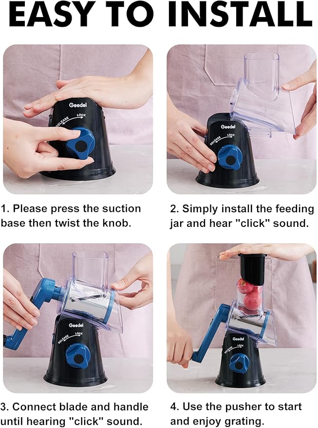 - Subtle Design : The powerful suction base keeps the cheese grater firm on a clean or smooth counter-tops like marble, glass. Plus, the transparent barrel with an inclined curvature reduce jamming in the cheese shredder