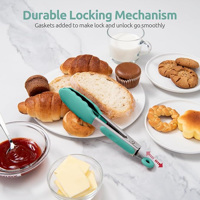 - [Easy & Ergonomic Locking Mechanism] The upgraded food serving tong has a smooth locking mechanism. With the added gaskets, you can easily lock and unlock the tongs. With more and larger 18/10 stainless steel springs, it achieves a perfect balance between too tight to open and too loosen to grasp food. Simply hold the open tongs closed, pull the tab out to lock them closed and push the tab in to re-open for grabbing food. The pin holds two parts of the tong is tightly, no breaking issues.