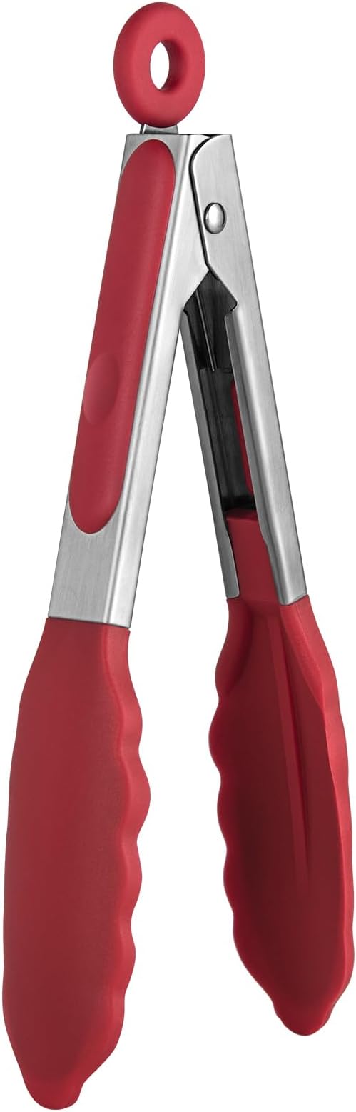 480ºF Heat Resistant Kitchen Tong: U-Taste 7 inch Silicone Cooking Tong with Firm Sealed Non Stick Rubber Tips & Silicon Coated 18/8 Stainless Steel Handle & Smooth Locking for Serving Salad (Red)