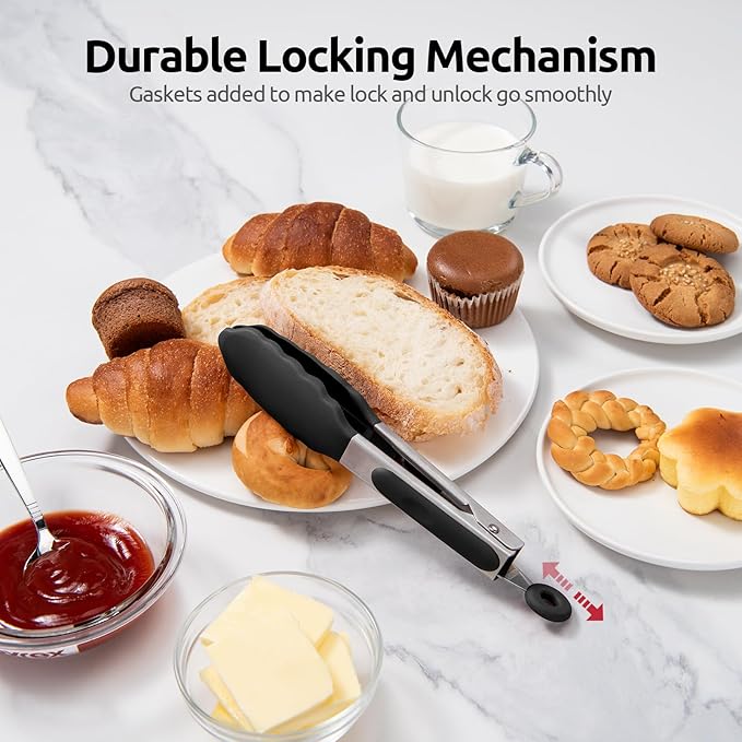 - [Easy & Ergonomic Locking Mechanism] The upgraded food serving tong has a smooth locking mechanism. With the added gaskets, you can easily lock and unlock the tongs. With more and larger 18/10 stainless steel springs, it achieves a great balance between too tight to open and too loosen to grasp food. Simply hold the open tongs closed, pull the tab out to lock them closed and push the tab in to re-open for grabbing food. The pin holds two parts of the tong is tightly, no breaking issues.
